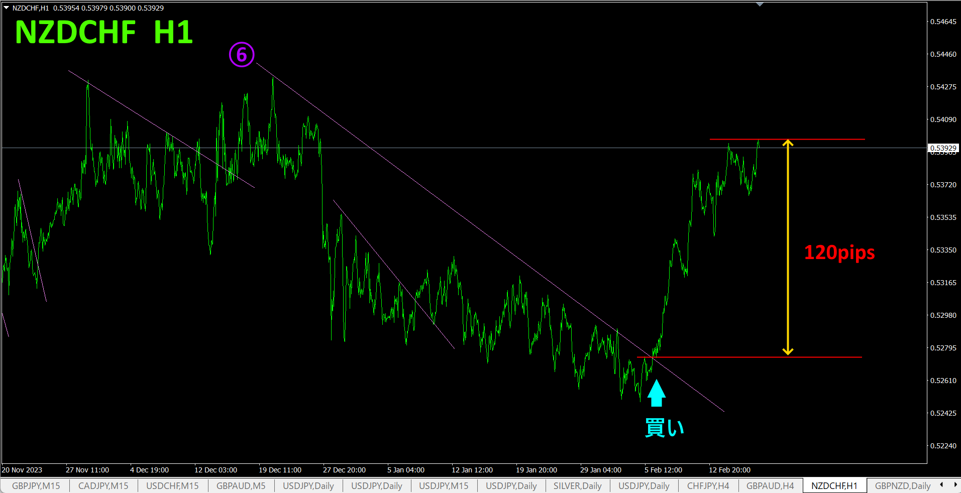 2505「天底Searchインジケータ」を使い、大底に位置する通貨ペアとしてNZDCHFを選択しました。大底からの上昇を狙っています。