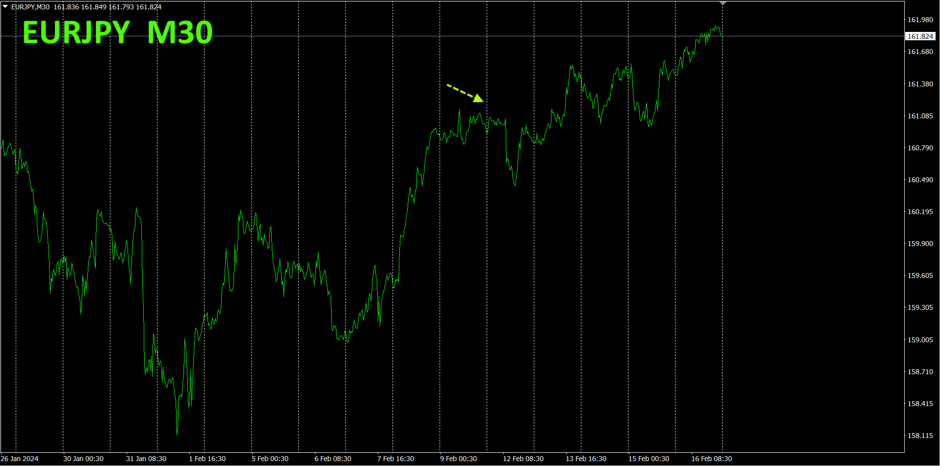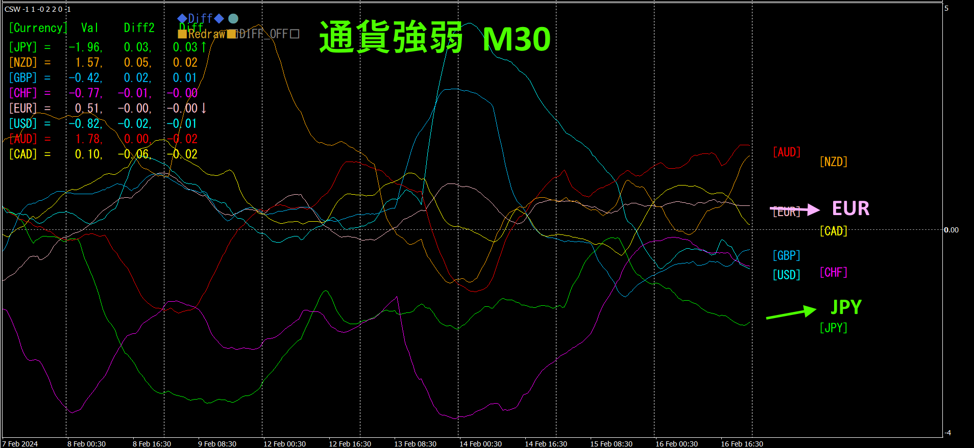 ピンク色がEUR、緑色がJPYです。JPYはやや上向きになり、EURはやや下向きになっています。あまり方向感の無いチャートですが、EURJPYはやや下がるだろうと考えられます。