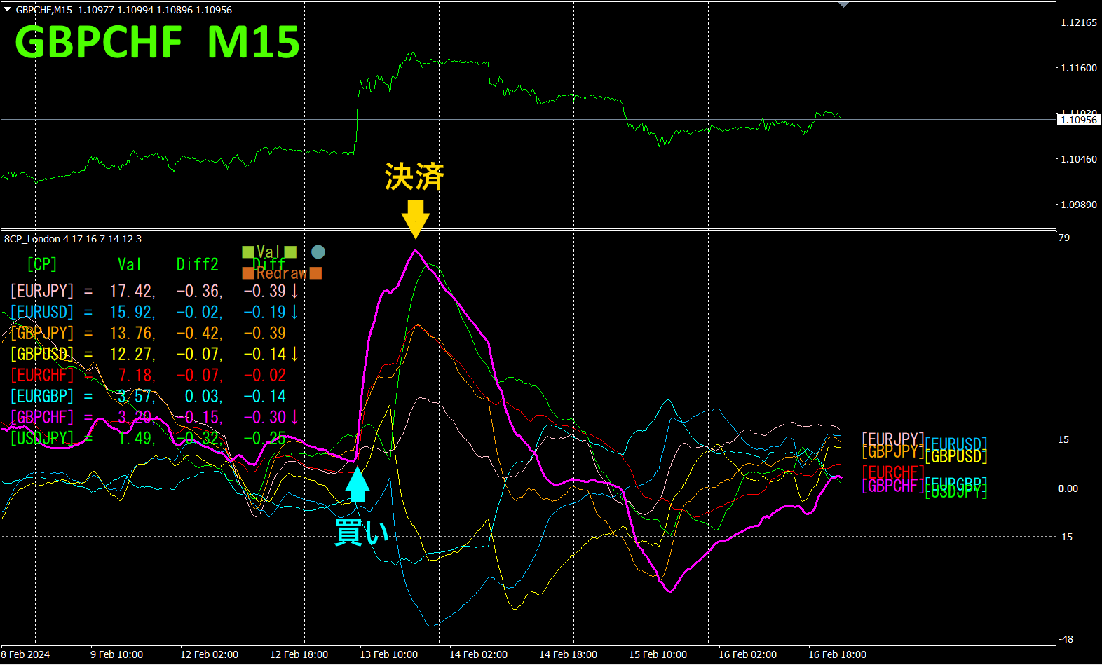上半分は、GBPCHFの15分足チャートです。下半分は、「8CP見える化インジケータ」によるものです、赤紫色太線のグラフがGBPCHF に相当します。