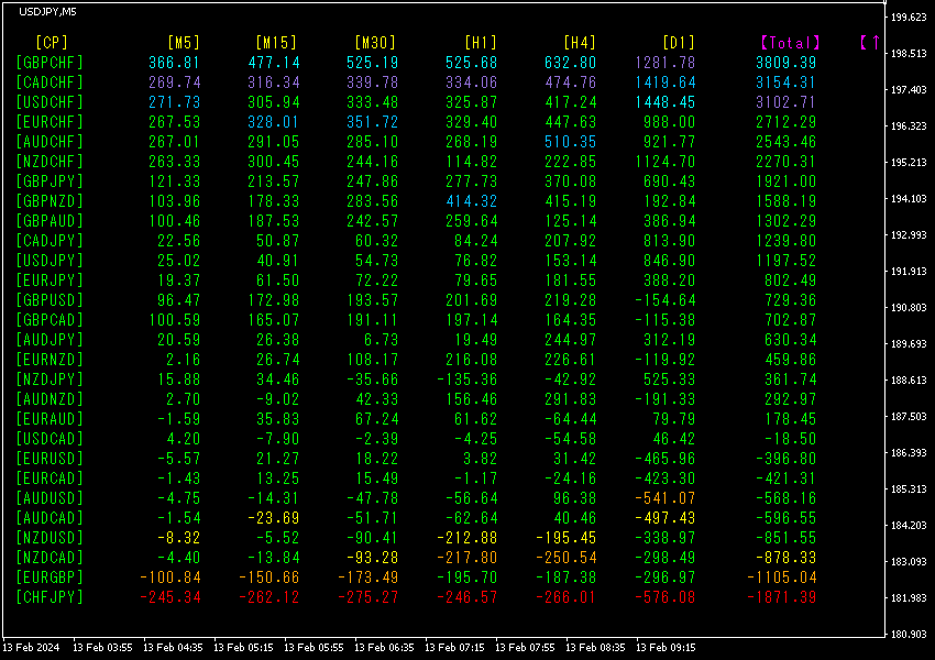Total数値の降順に並び替えています。最も上の行にあるGBPCHFは、全ての時間足で青色系の表示色になっていて、Total数値が