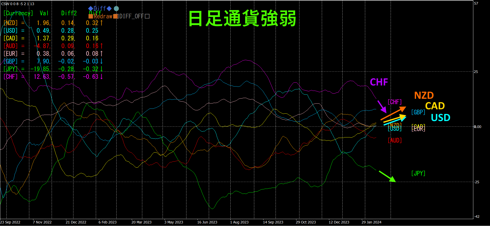 NZD、USD、CADが上向きです。一方、CHF、JPYは下向きになっています。日足チャートでは、NZDの強さとCHFの弱さが目立っています。
