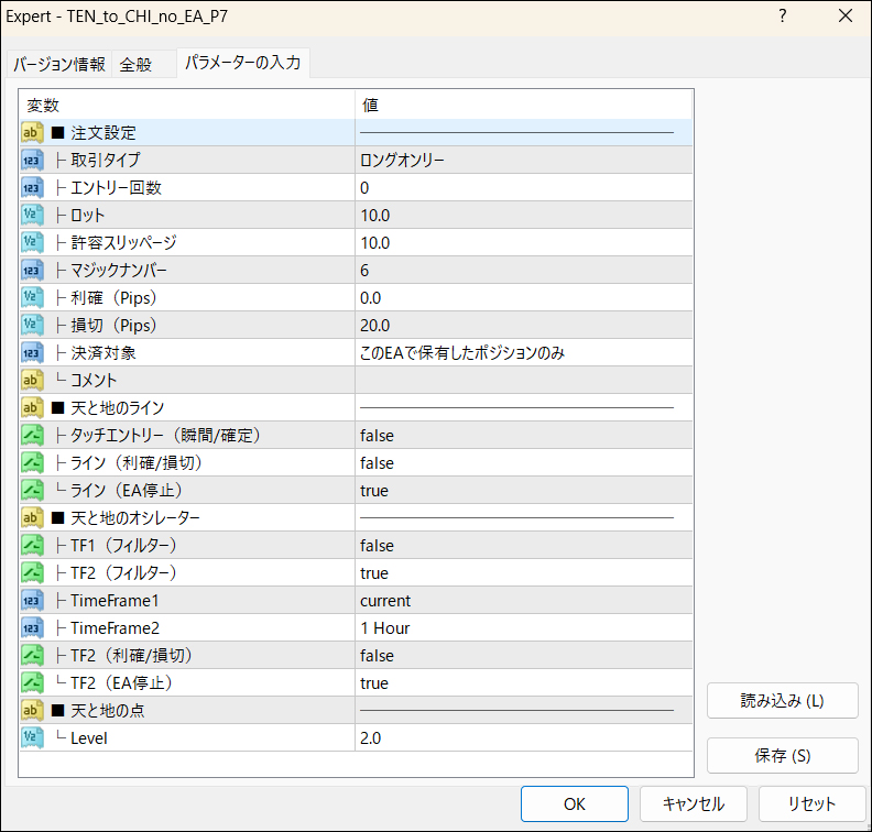 EAパターン⑦を使用します。4時間足で上目線と判断したら15分足にてセットします。本来の使い方は、他のEAパターンのようにオシレーターTF2の色転換を待つ必要はございません。ただし今回は初心者向けの使い方をご紹介しているので、オシレーターTF2が青+ヒストグラムが青+ローソク足がラインの近く、この条件の場所でセットします。パラメーターは以下の通りです。