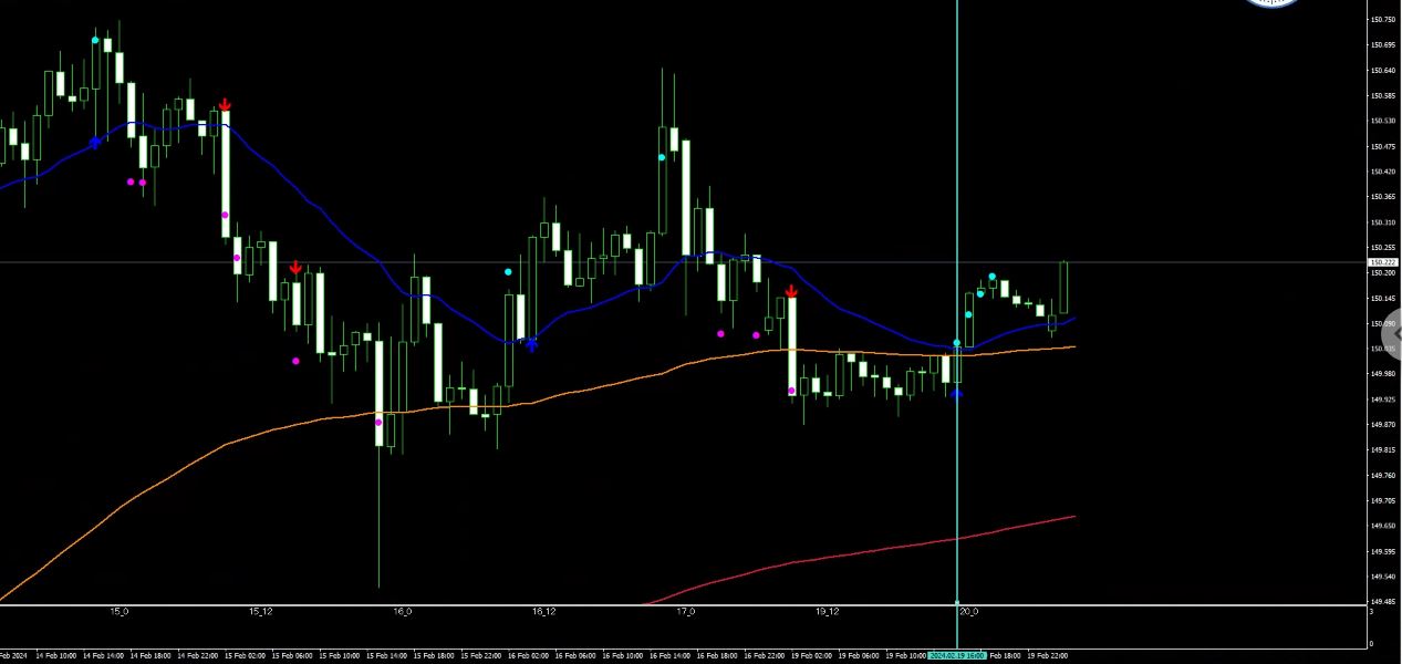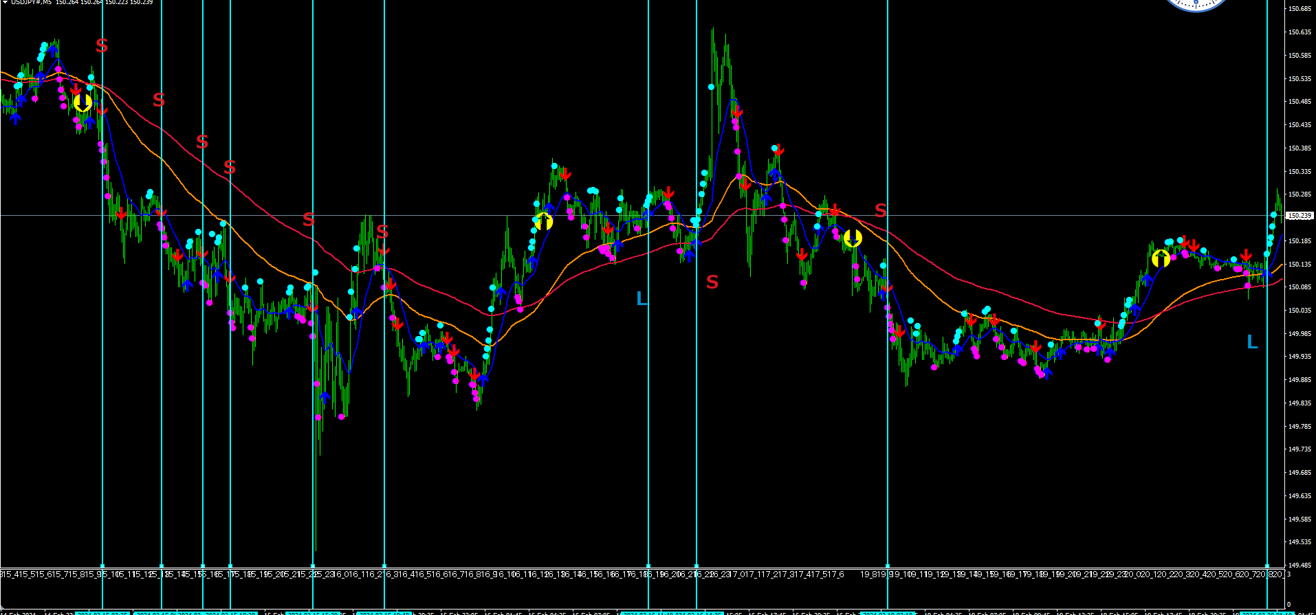 わかりづらいかもで恐縮なのですがエントリーポイントに縦線そしてショートのばあいは赤字でS、ロングの場合は青地でLと付け加えています。