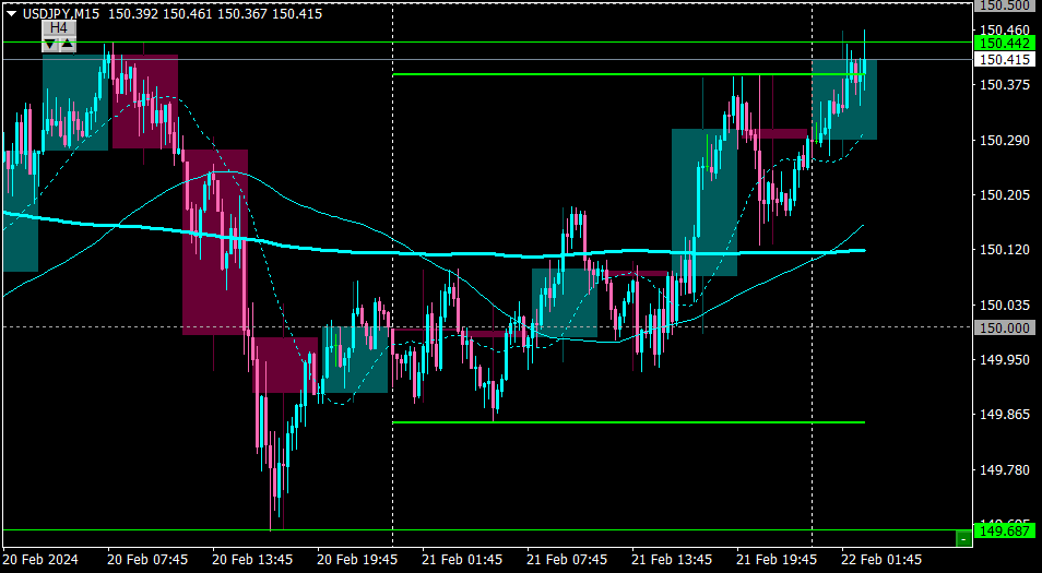 〇前日のトレード・USDJPY ドル円(15分足)先週の金曜は、強いと思われたサポート150.50を割り込んできたので、シナリオ変更しショート。ロング勢の損切りも巻き込んで大きく下げた。+71pips