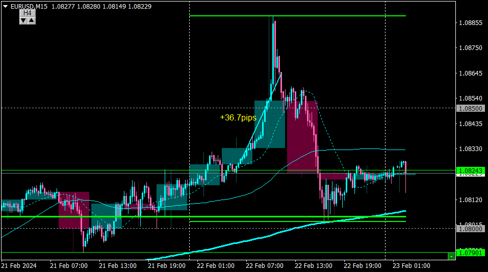 昨日は1.080での押し目を待つつもりだったが、そのまま上昇したのでシナリオ変更。H4の足での前日高値ブレイク確定後、次のH4の足の陽転のタイミングでロング。