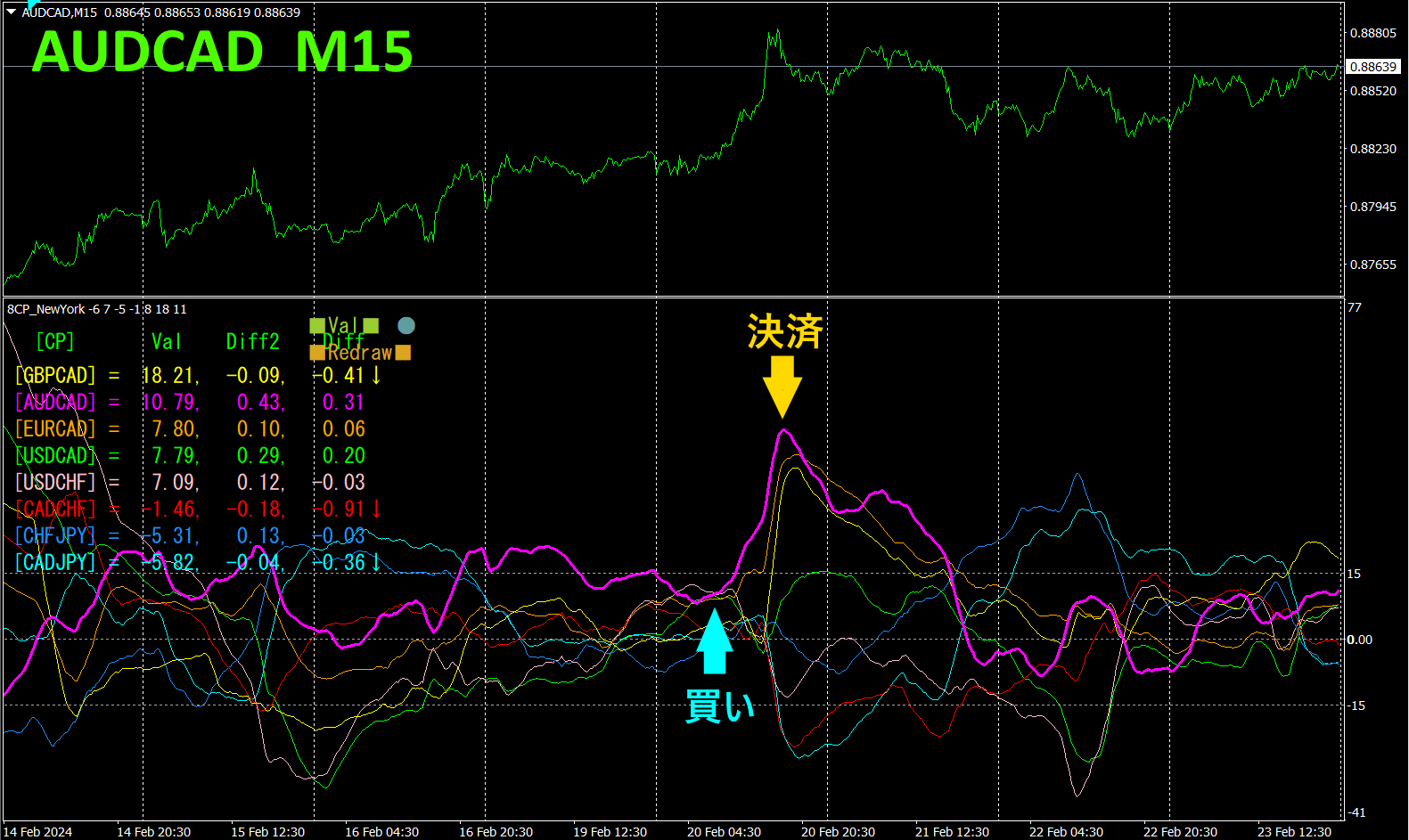 上半分は、AUDCADの15分足チャートです。下半分は、「8CP見える化インジケータ」によるものです、赤紫色太線のグラフがAUDCAD に相当します。