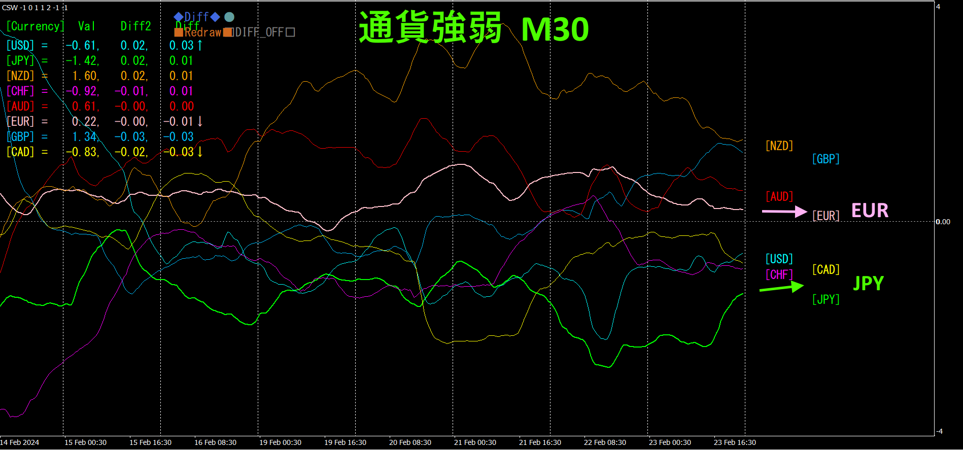 ピンク色がEUR、緑色がJPYです。JPYもEURもほぼ水平方向になっています。方向感の無いチャートなので、方向性が掴めません。