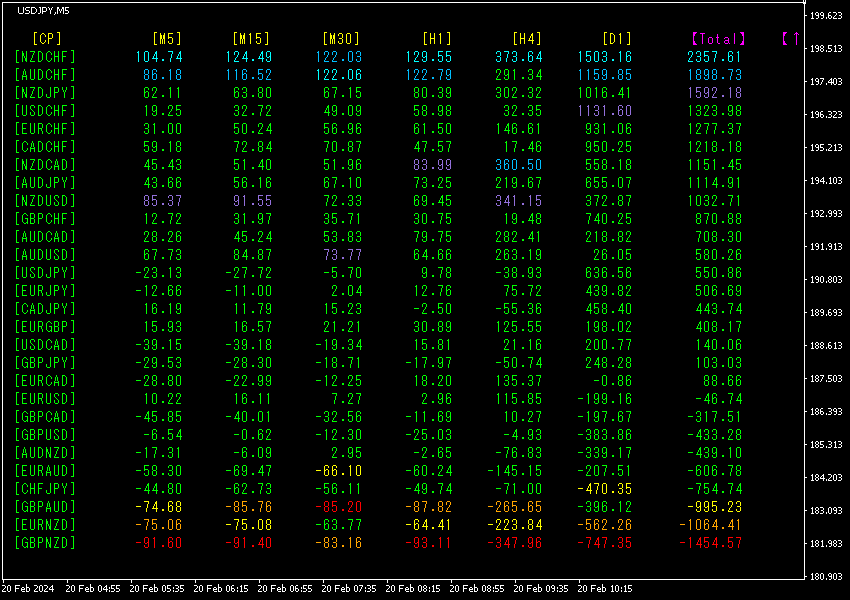 Total数値の降順に並び替えています。最も上の行にあるNZDCHFは、全ての時間足で青色系の表示色になっていて、Total数値が