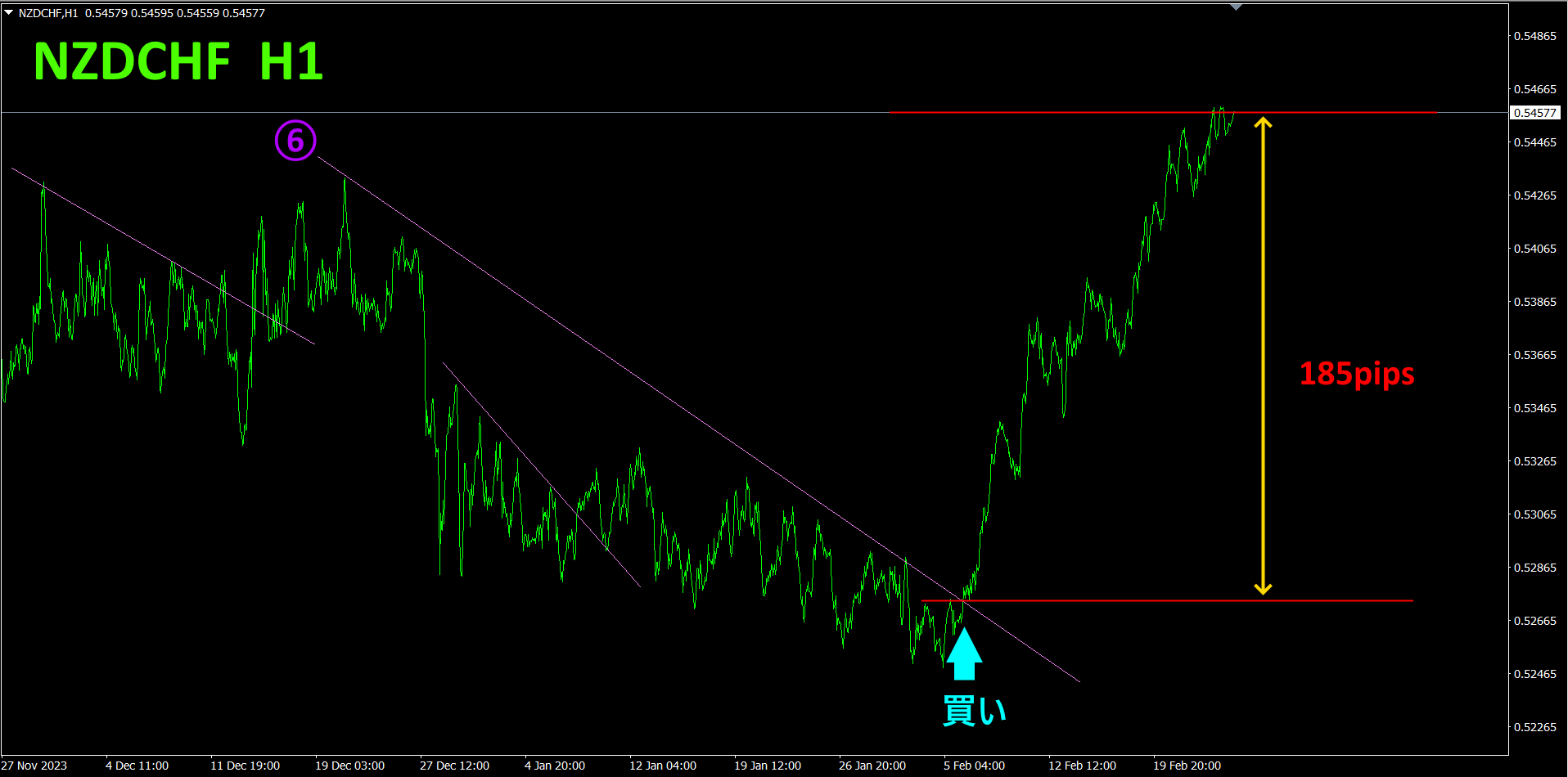 2505「天底Searchインジケータ」を使い、大底に位置する通貨ペアとしてNZDCHFを選択しました。大底からの上昇を狙っています。