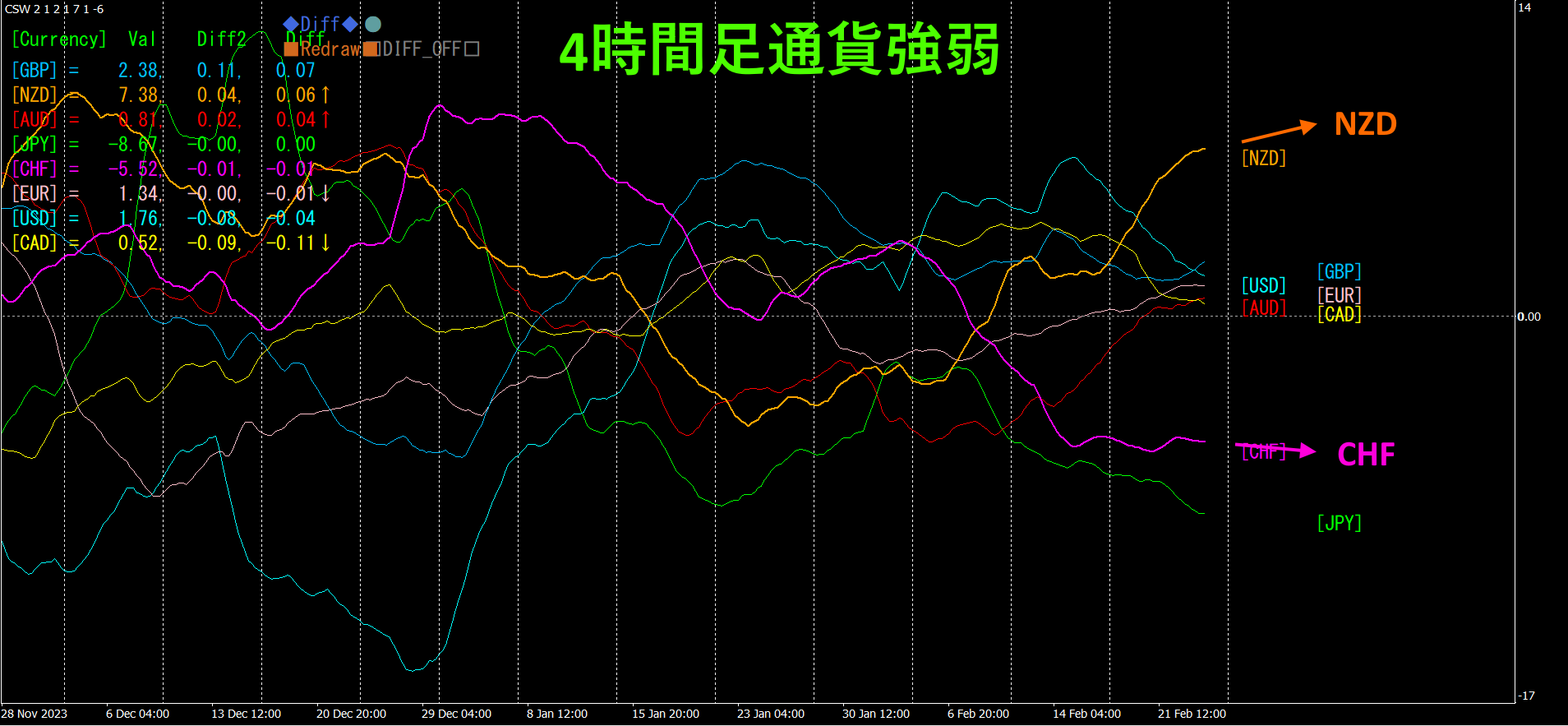 赤紫色がCHF、橙色がNZDです。NZDはやや上向きで、CHFはやや下向きです。そろそろ、NZDとCHFの乖離が収まってくるものと想定されますので、「早めに利確して良し」とします。もちろん、まだもう少しだけ伸びるだろうという見方もできるので、その辺りは投資家の判断によります。