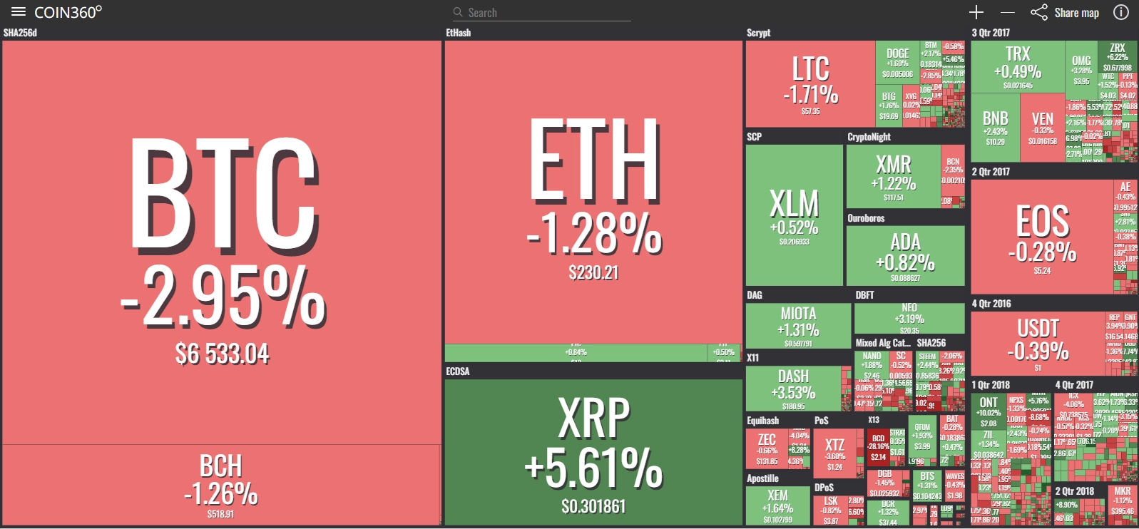 coinmarketcap(コインマーケットキャップ)のサイトから、ドミナンス(各銘柄が仮想通貨全体の時価総額に占めるパーセンテージ)を定点観測していきます。仮想通貨全般が下方向に大きく動き出している相場状況を受け、毎日更新することとし、仮想通貨業界を俯瞰および転換期を早期に発見することを目的とします。