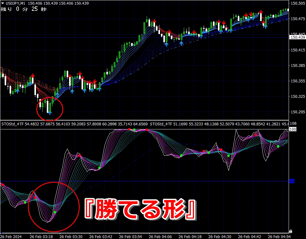 ② 矢印サイン点灯状態で、インジケーターのピンク色の帯が、緑の帯を下からすくい上げるような形状であれば、現在のローソク足が確定する数秒前か確定の直後に1分判定または3分判定でハイエントリーします。