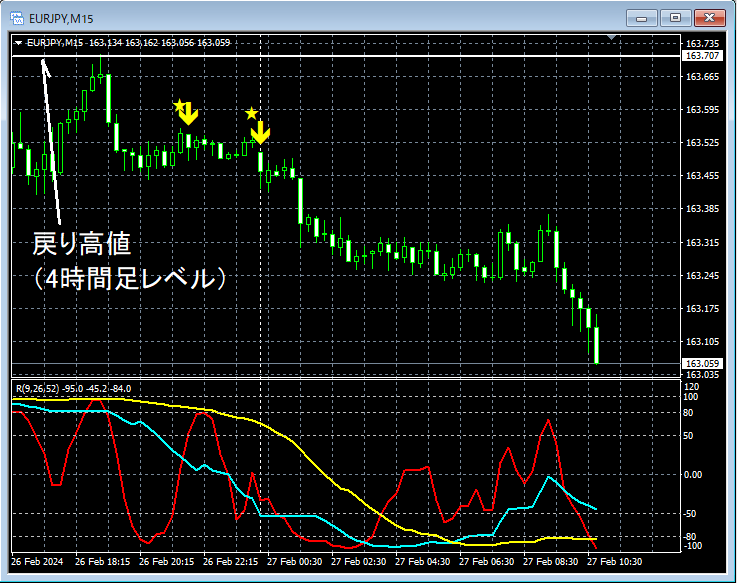 上の15分足では、戻り高値(4時間足レベル)を上抜けすることができず反落。下げの途中でmBDSR(RCI2本フィルター)の戻り売りサインが2回点灯して下げている。