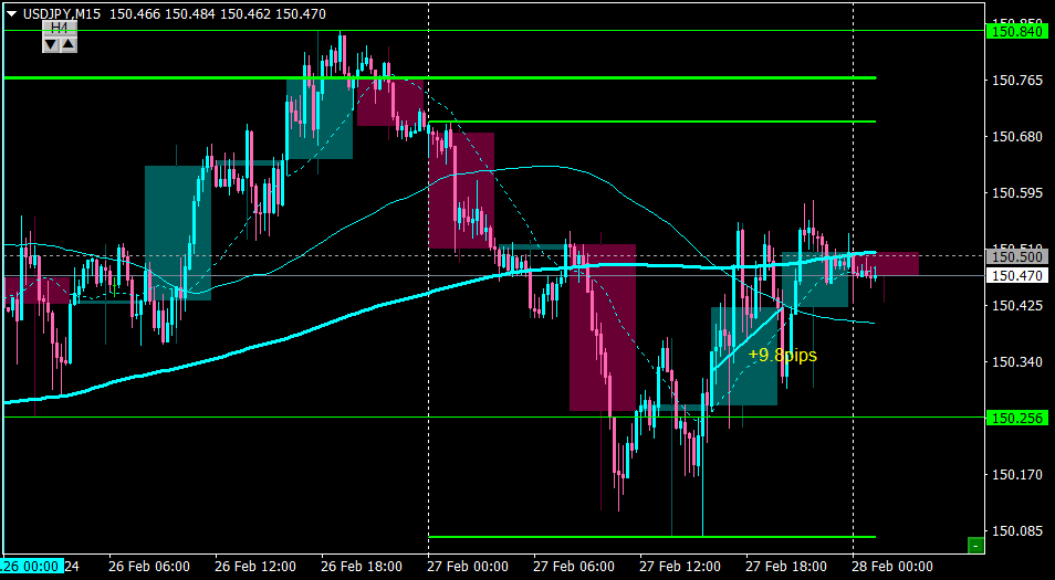 昨日は朝方から売られ、ネックライン150.0付近まで下げたのでM15レベルのWボトム&H1の足の下ヒゲを確認後にロング。