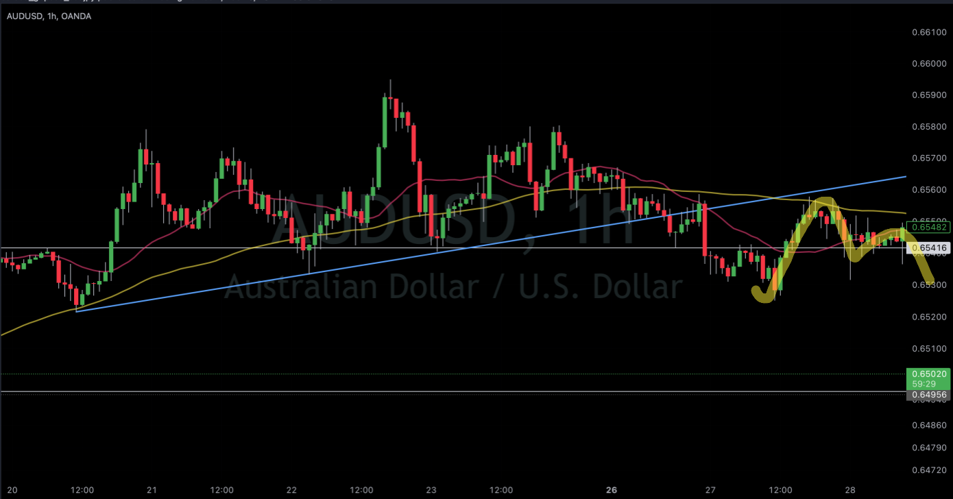 1時間足、戻り工房から高値切り下げ安値更新となればもう一段下げてくるか