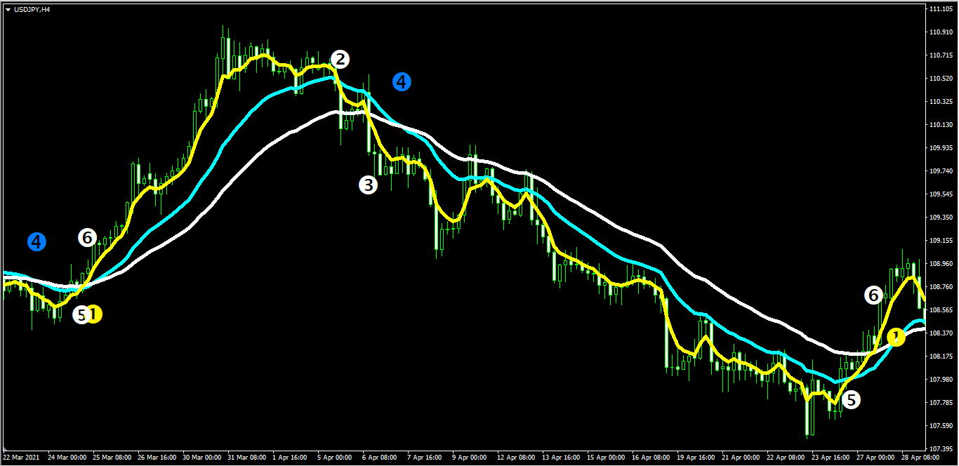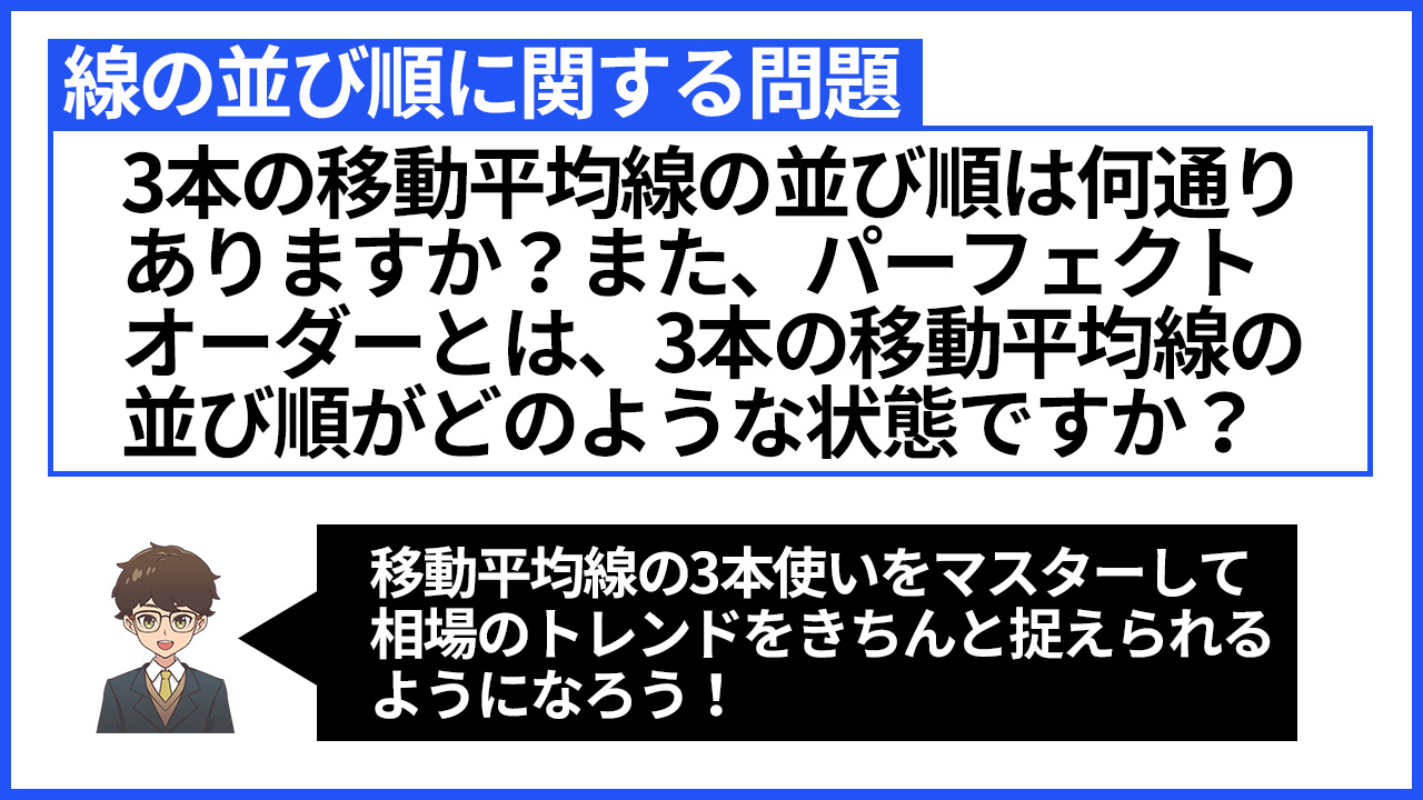 3本の移動平均線の並び順に関しては、簡単な数学の問題で、3!=3×2×1=6通り。