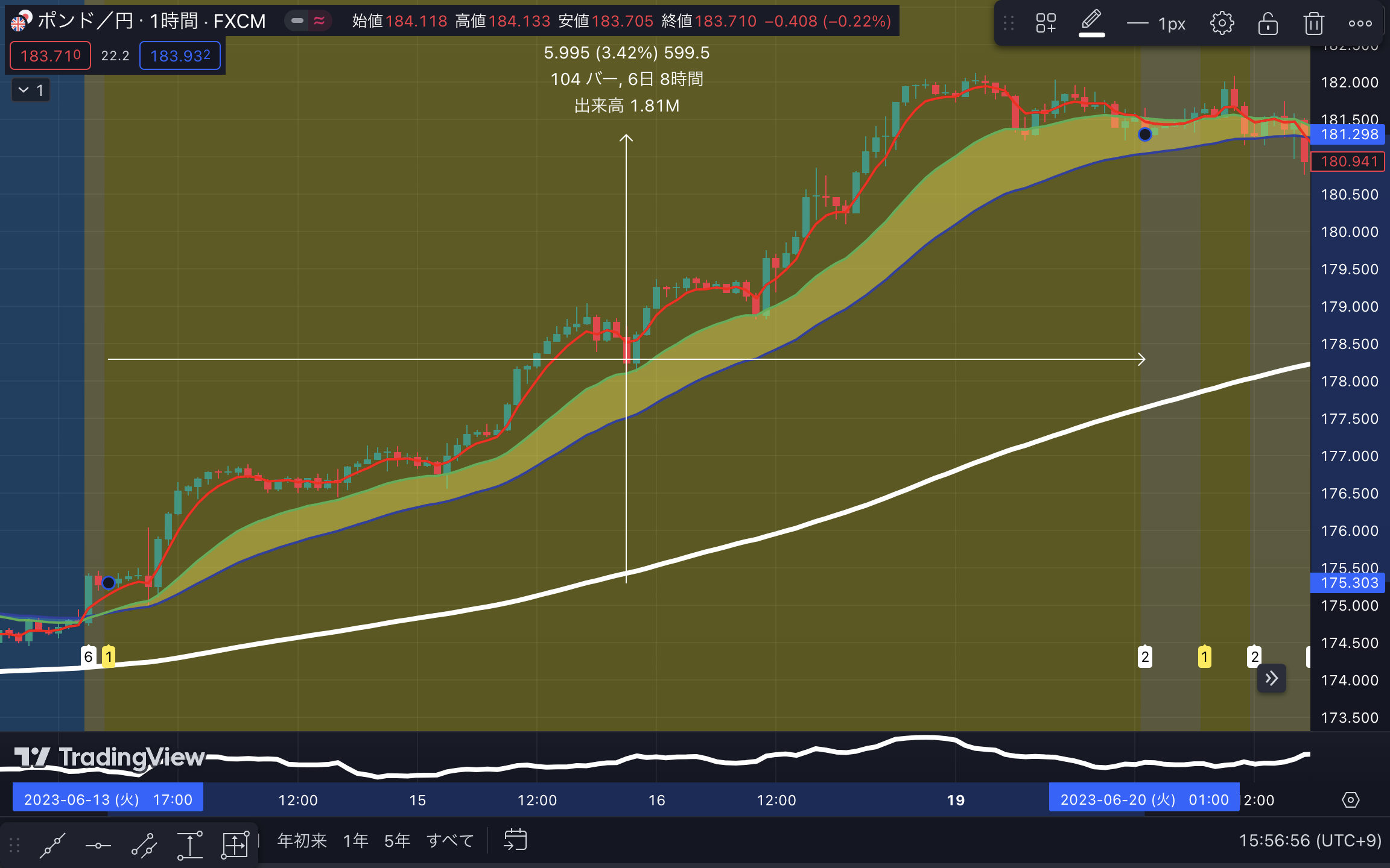 2023年6月のポンド円の相場で600pipsも取り逃したのを、今でもはっきり覚えています。押し目もつけず上がる相場を指をくわえて見るしかなかったです。逆張りはしなかったので損失は出しませんでしたが。