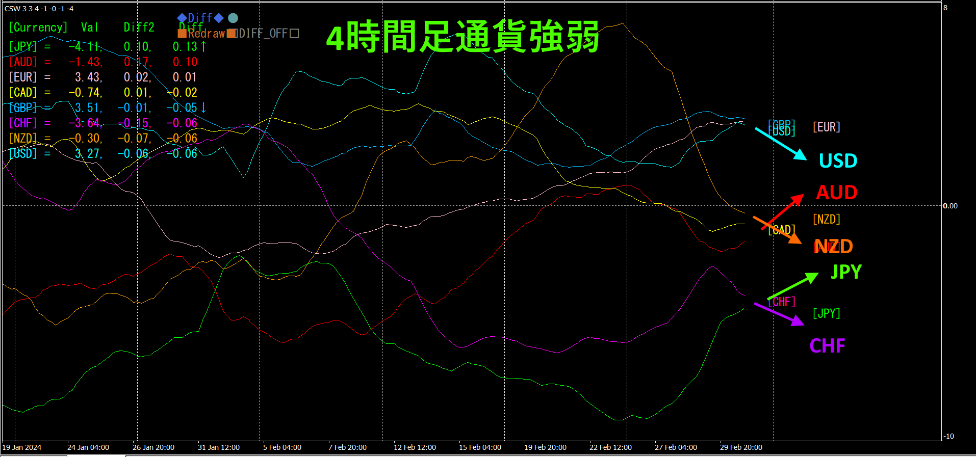 4時間足では、JPY、AUDが上昇しています。一方、USD、NZD,CHFが下向きになっています。CHFが弱くなり、JPYが強くなってきています。