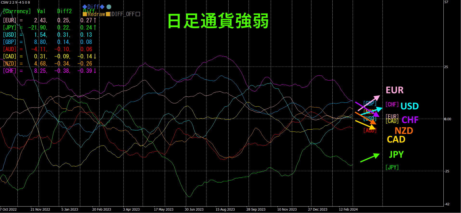 EUR、JPY、USDが上向きです。一方、CHF、NZD、CADは下向きになっています。日足チャートでは、EURが強くCHFが弱くなっています。