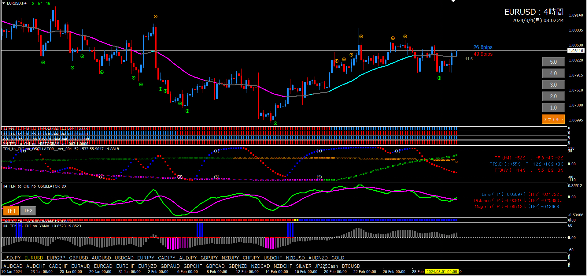 今回はユロドルの検証となります。4時間足のオシレーターTF2が-80から綺麗に上昇しているので上目線候補として狙っていた通貨ペアでした。先週の考察記事でも候補の一つとして挙げておりましたね。