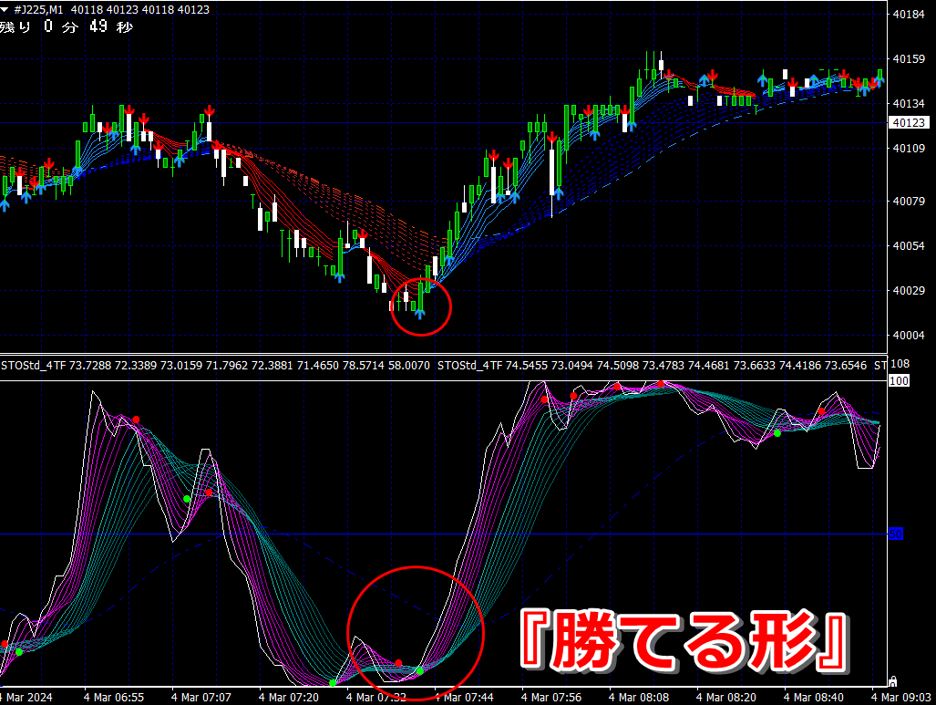 ★ サイン点灯後、ピンク帯が緑帯をすくい上げる形状で必勝エントリー!