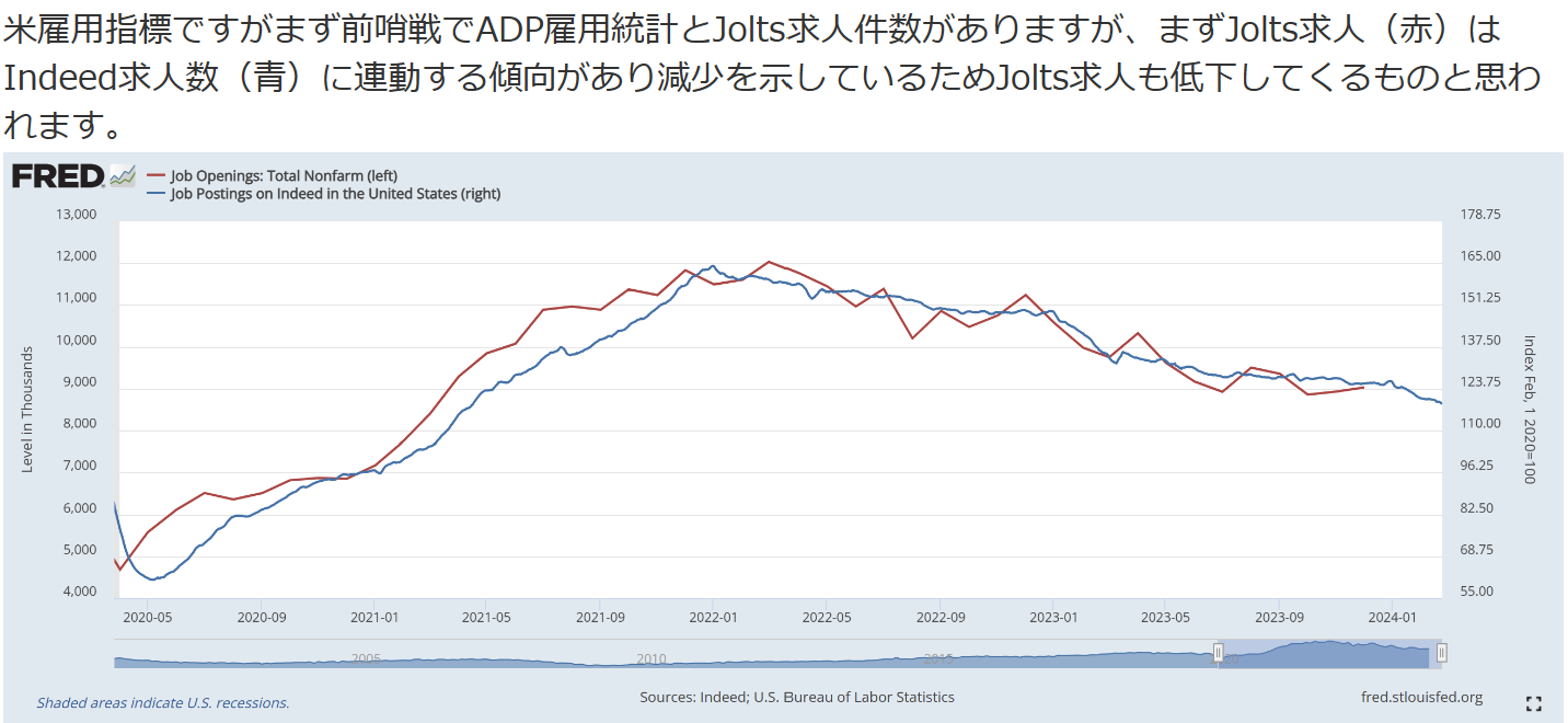 本日はパウエル議長が下院での証言が0:00から行われます。恐らくPivotとなるような発言は出ないでしょう。利下げ織り込みが加速するような発言は出にくいと思われ同じく0:00に発表されるJolts求人数で動くかは微妙ですが、下げるようであれば戻すような展開となるのでは?と想定しています。