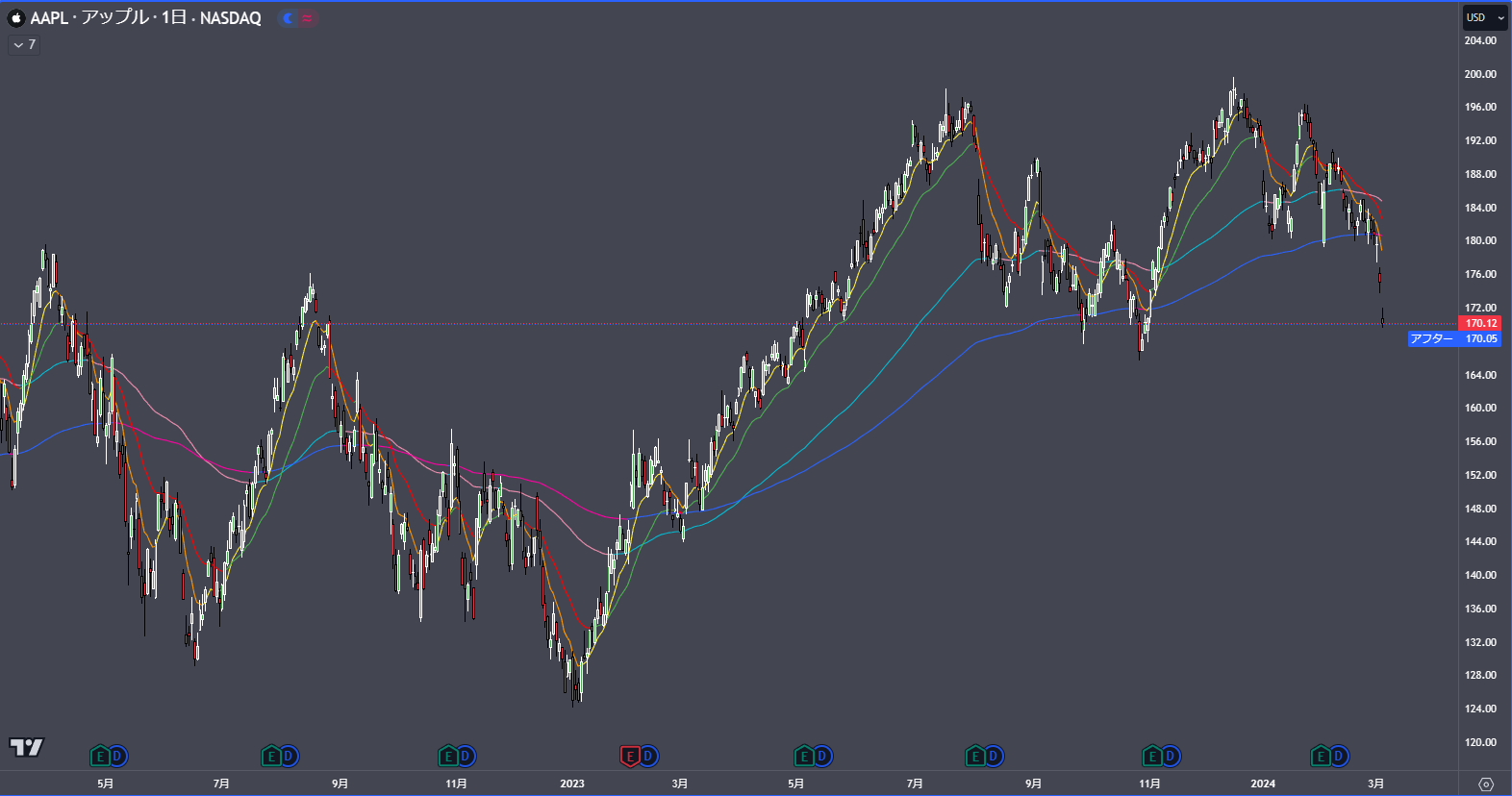 大型株、特にappleが中国でのiPhoneの販売不振やEV投資を注視しAIプロジェクトにリソースを振ると発表し大幅に売られています。