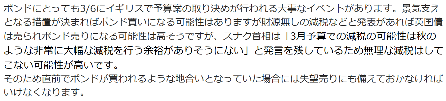 またイギリスの財政報告での予算案が21:30頃に発表が予定されています。以下のような展開となる可能性は考えておきたいです。さすがに財源無しなどの無茶な減税はしてこないと思われますので無難に終わるか、減税も越してロンドンオープンからの期待買いも考えておきたいところです。