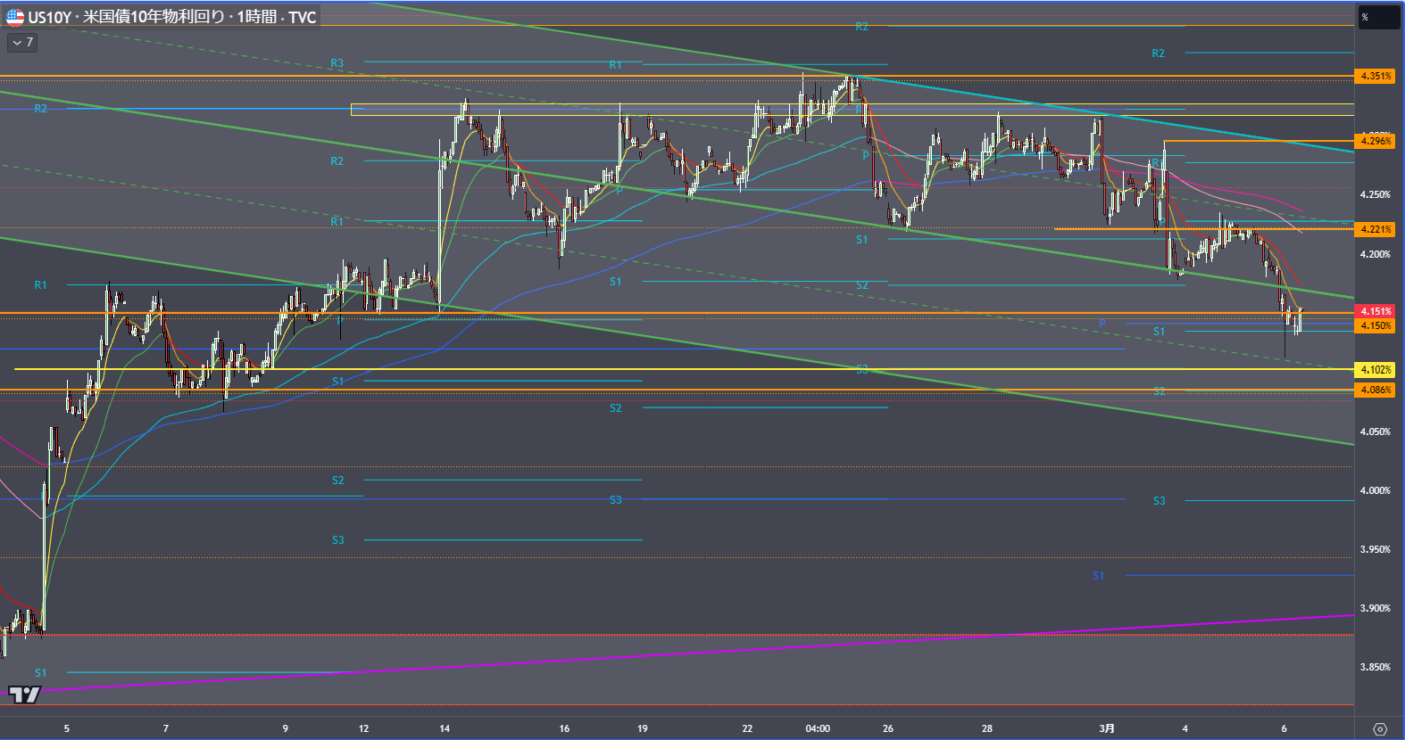 昨日は株式が大幅安だったこともありブルフラット化しリスクオフの債券買いが進んでいます。何とか4.15%を守った印象で本日4.08%を抜けるかどうかの攻防がありそうですがおそらくこの水準は守りそうです。