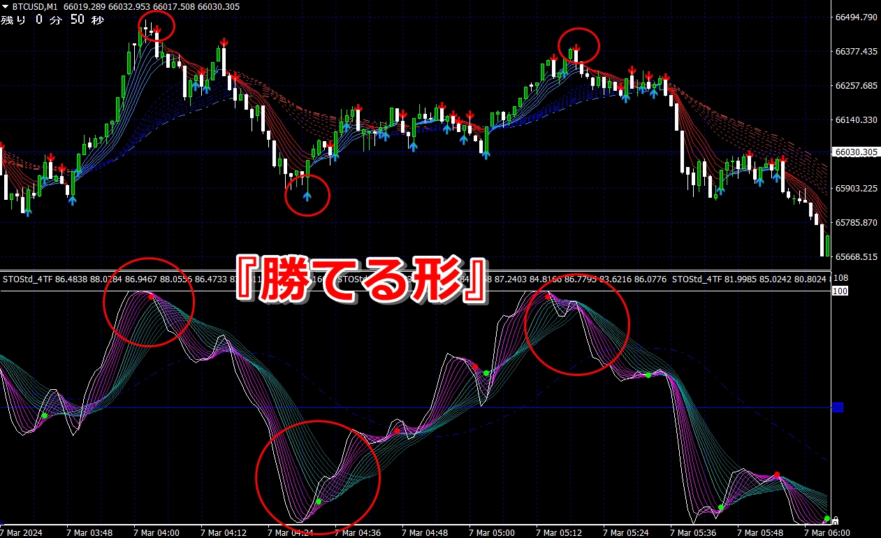 ② 矢印サイン点灯状態で、インジケーターのピンク色の帯が、緑の帯を下からすくい上げるような形状であれば、現在のローソク足が確定する数秒前か確定の直後に1分判定または3分判定でハイエントリーします。