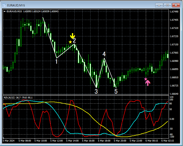 上の15分足には、5分足のエリオット波動を表示してある。5分足下降第3波開始直前で15分足のmBDSR(RCI2本フィルター)の戻り売りサインが点灯して下げている。