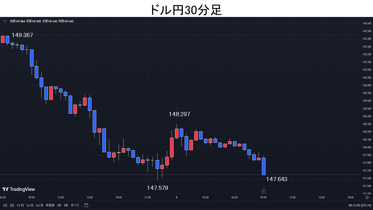 日銀金融政策の早期修正観測による円買いで、ドル円は147.57円まで急落。
