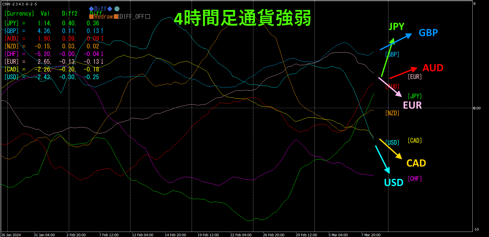 4時間足通貨強弱グラフから、読み取るとするならば、今週のトレードは、次の通貨ペアに注目すると良いでしょう。