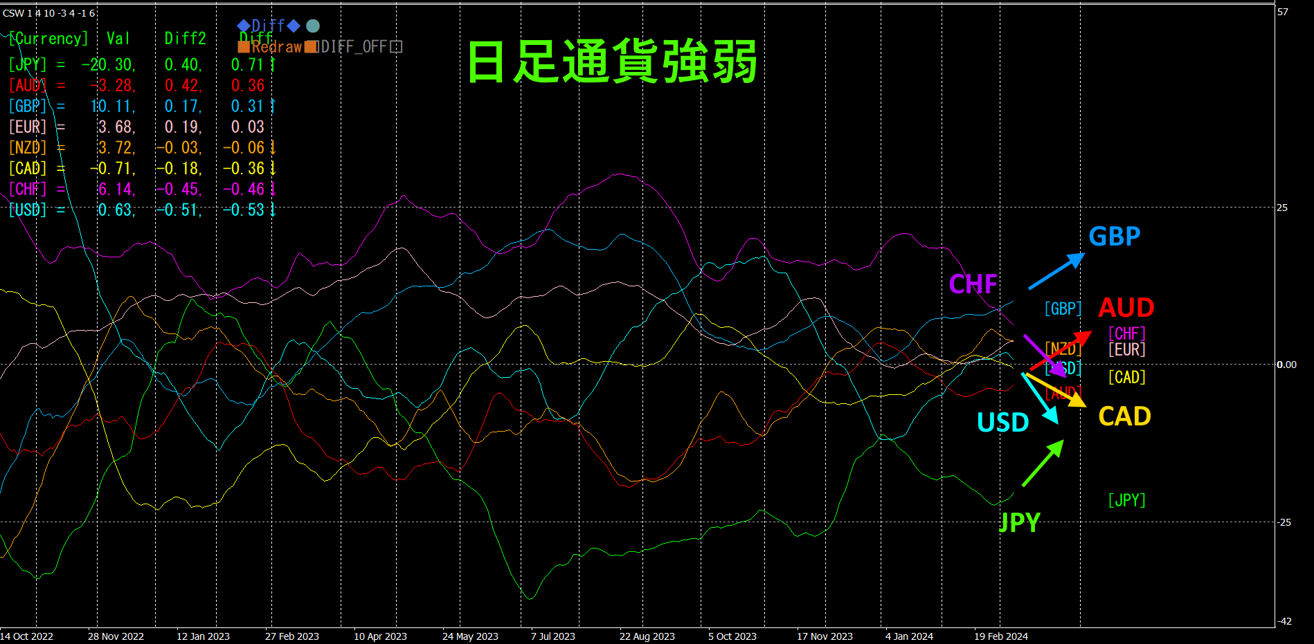 JPY、AUD、GBPが上向きです。一方、USD、CHF、CADは下向きになっています。日足チャートではJPYが強くUSDが弱くなっています。