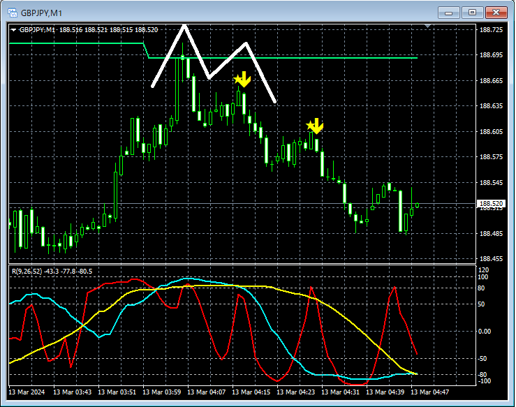 上の1分足では、1時間足EMA21付近でダブルトップを形成して下げている。ダブルトップの右側の山でmBDSR(RCI2本フィルター)の戻り売りサインが点灯するパターン。その後の下げの途中でも戻り売りサインが点灯している。