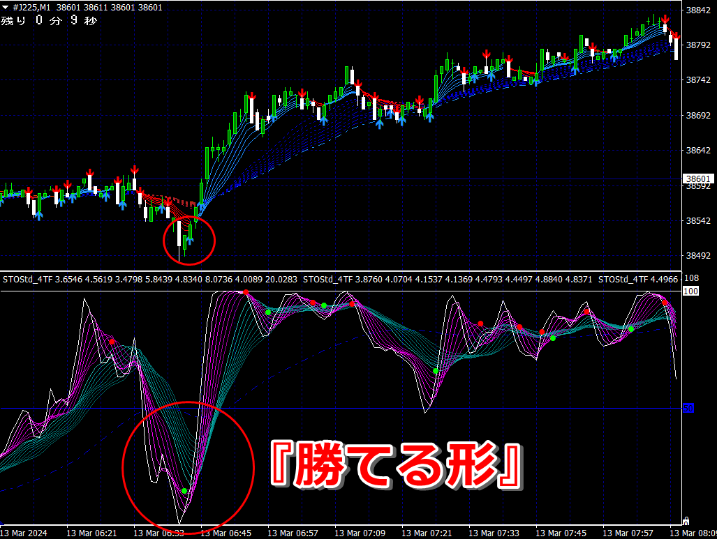② 矢印サイン点灯状態で、インジケーターのピンク色の帯が、緑の帯を下からすくい上げるような形状であれば、現在のローソク足が確定する数秒前か確定の直後に1分判定または3分判定でハイエントリーします。