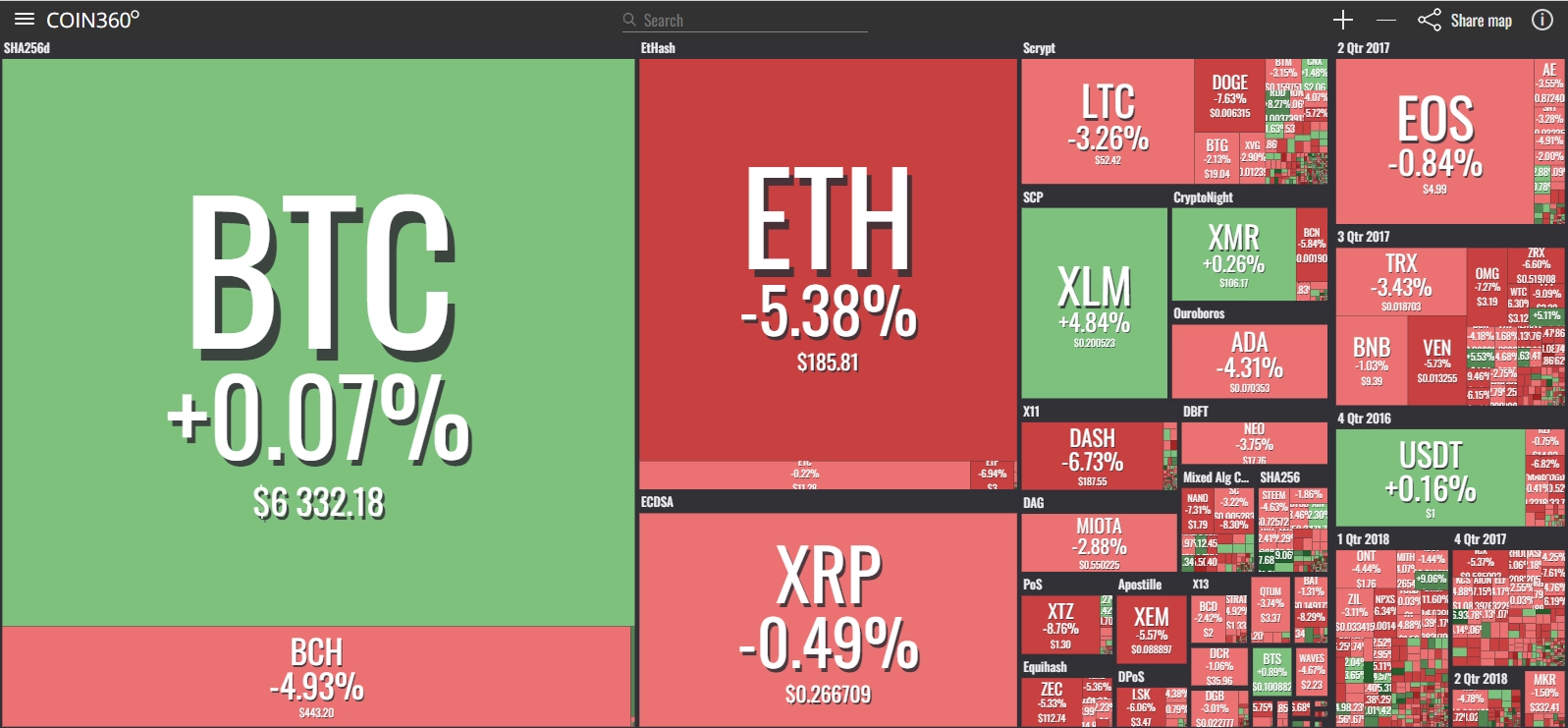 coinmarketcap(コインマーケットキャップ)のサイトから、ドミナンス(各銘柄が仮想通貨全体の時価総額に占めるパーセンテージ)を定点観測していきます。仮想通貨全般が下方向に大きく動き出している相場状況を受け、毎日更新することとし、仮想通貨業界を俯瞰および転換期を早期に発見することを目的とします。