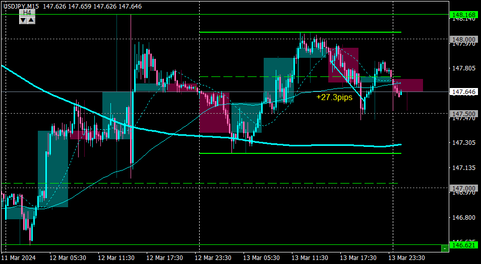 節目である147.50を下抜けず折り返してきたのでイグジット。+27.3pips