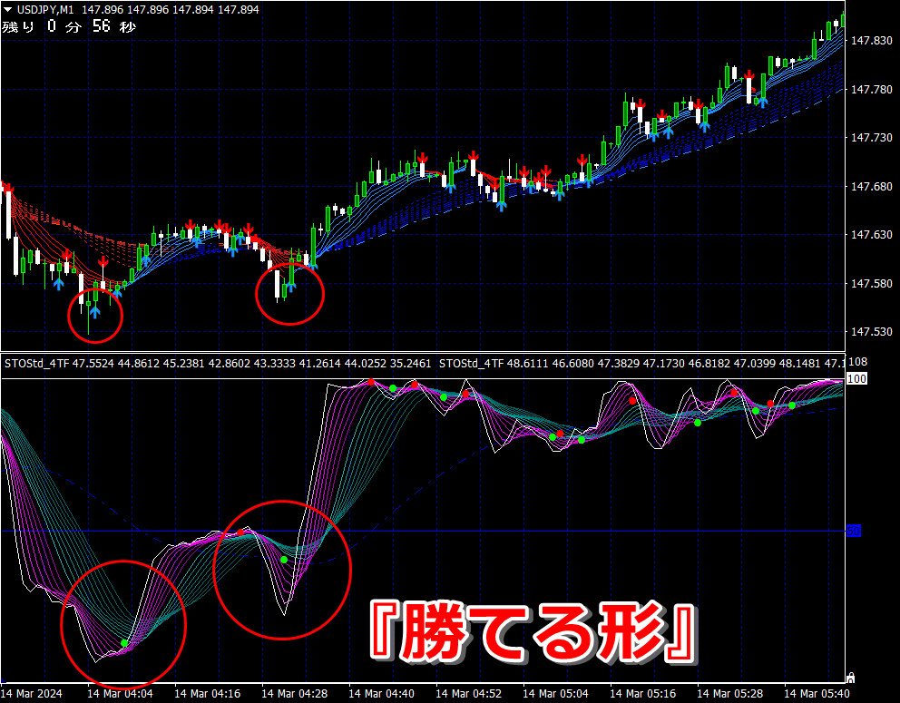★ サイン点灯後、ピンク帯が緑帯をすくい上げる形状で必勝エントリー!