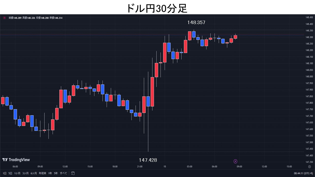 東京時間、ドル円は日経平均株価の下落や本邦長期金利の上昇を受け、一時147.53円まで下落。その後は、日経平均の買戻しなどを受け147.97円まで反発。欧州時間、ドル円は147円台後半で堅調推移。NY時間、米PPIが予想を上振れると、ドル円は148円台を回復。その後、「日銀は来週18-19日に開く金融政策決定会合で、マイナス金利政策を解除する方向で調整に入った」「長期金利を1%に誘導する長短金利操作(YCC)の撤廃を含めて、大規模金融緩和の正常化に踏み切ることを検討」との一部報道が伝わると、147.42円まで下落。その後は、米10年債利回りが上昇し、ドル円は148.35円まで上昇。