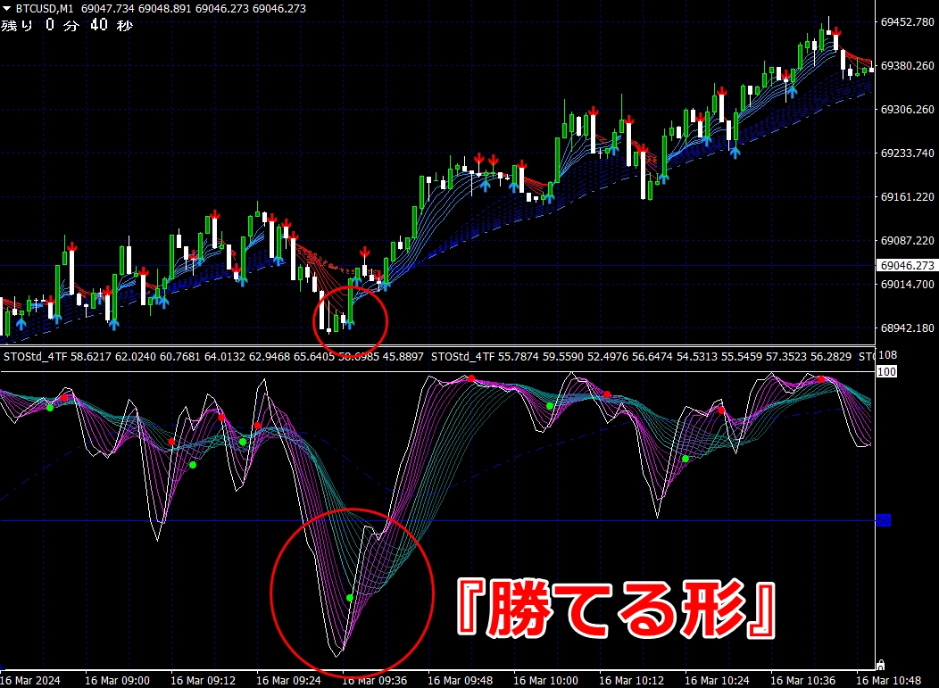 ② 矢印サイン点灯状態で、インジケーターのピンク色の帯が、緑の帯を下からすくい上げるような形状であれば、現在のローソク足が確定する数秒前か確定の直後に1分判定または3分判定でハイエントリーします。
