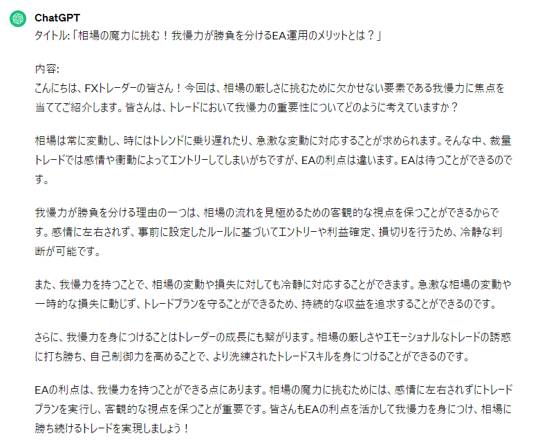 3/21【ChatGPT】相場の魔力に挑む!我慢力が勝負を分けるEA運用のメリットとは?