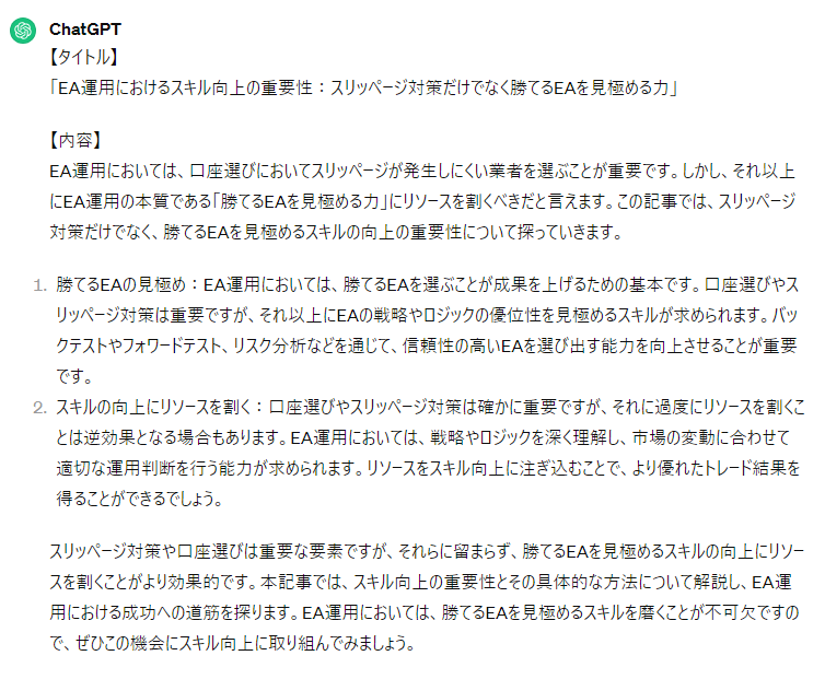 3/26【ChatGPT】そもそも勝てるEAであるかどうかを見極めるスキルの向上にリソースを割くべきだと思います