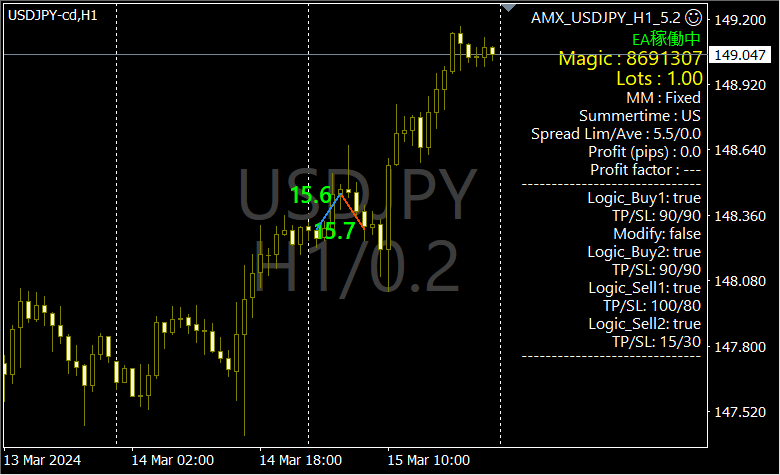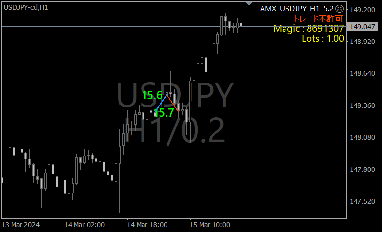 チャート上で簡易に成績がわかるよう、チャートにトレード線とPips表示、右側コメント欄にはProfitPipsとPFを表記。マイナスで赤字表記。