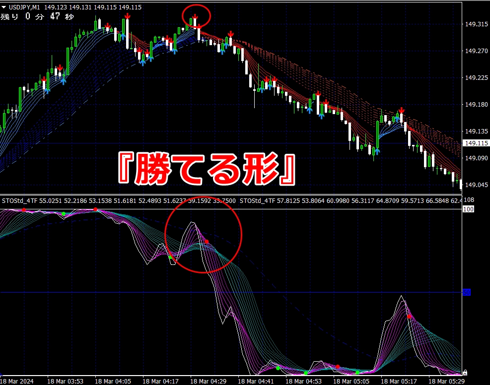 ② 矢印サイン点灯状態で、インジケーターのピンク色の帯が、緑の帯を下からすくい上げるような形状であれば、現在のローソク足が確定する数秒前か確定の直後に1分判定または3分判定でハイエントリーします。