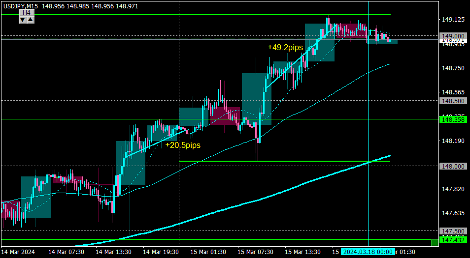 先週の金曜は、朝の戦略通り148.0付近で押し目を作ったが、値動きが急だったのですぐにはエントリーできず、148.50抜けでエントリー。