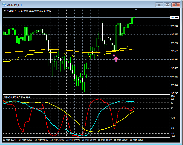 上の1時間足では、4時間足EMA21と1時間足EMA200が重なるあたりでmBDSR(RCI2本フィルター)の押し目買いサインが点灯して上昇している。