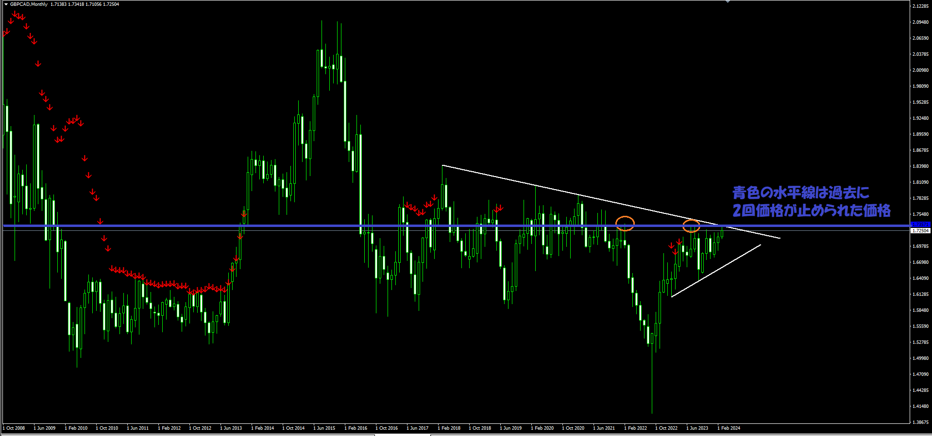 月足の青色の水平線と三角持ち合いの間を青色のラインに変えて赤