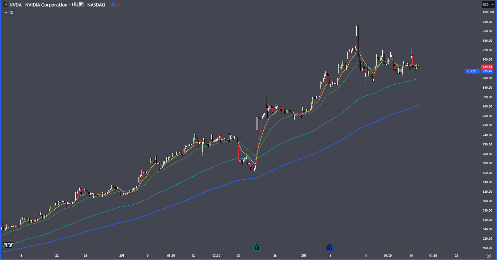 エヌビディアの基調講演が始まっておりGPUの発表がありましたが現在やや低下しており押し上げの材料としては弱い印象です。この発表が滑るとFOMCを目前に控え株価押し上げが厳しくなってくるため経過を待ち判断していきたいところです。