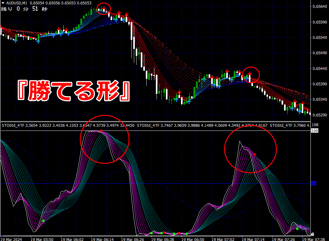 ② 矢印サイン点灯状態で、インジケーターのピンク色の帯が、緑の帯を下からすくい上げるような形状であれば、現在のローソク足が確定する数秒前か確定の直後に1分判定または3分判定でハイエントリーします。